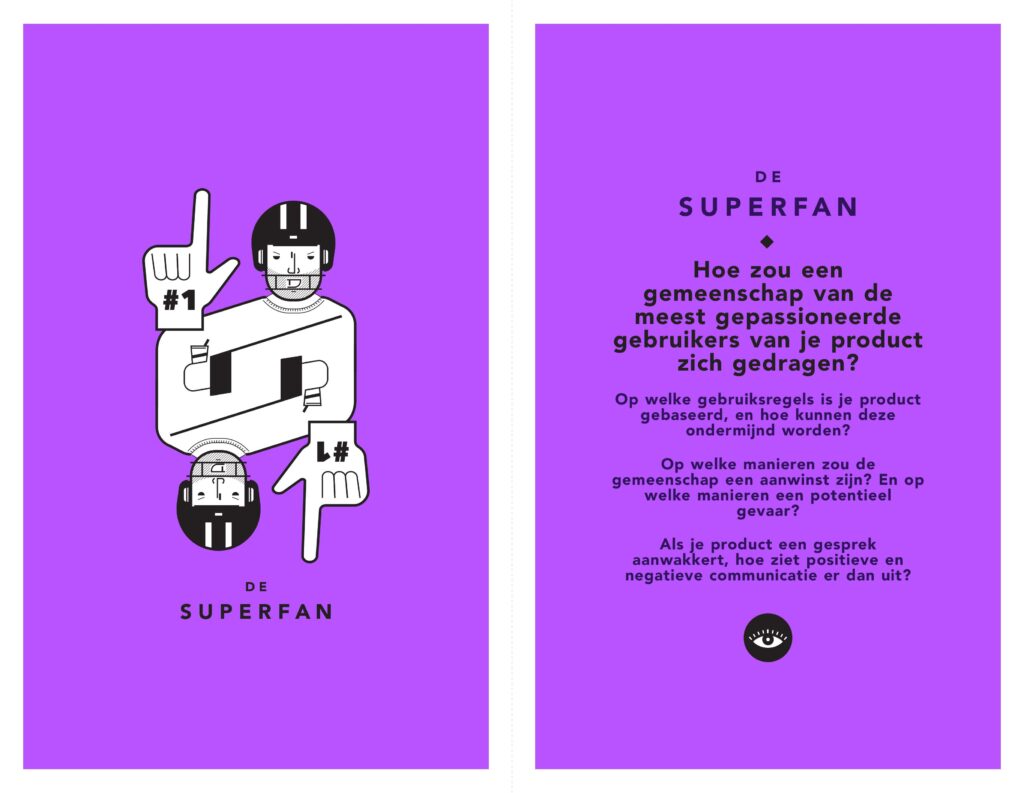 Hoe zou een gemeenschap van jouw meest gepassioneerde gebruikers zich gedragen? Op welke “spelregels” rust jouw product en hoe kunnen deze ondermijnd worden? Op welke manier zou de gemeenschap een voordeel zijn of juist een nadeel? Als jouw product discourse omvat, hoe zou positieve en negatieve communicatie eruit zien?
