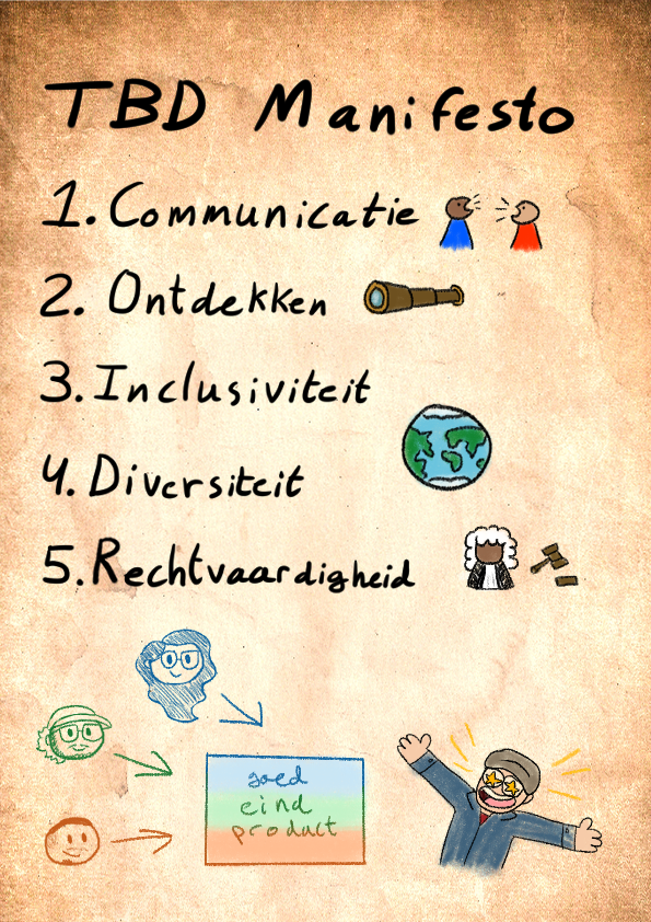 Wij zijn als groep op deze waarden gekomen door te kijken naar wat wij belangrijk vinden binnen de samenwerking met onze opdrachtgever, maar ook naar wat wij willen voor ons eindproduct. Met onze opdrachtgever vinden wij communicatie en ontdekking belangrijk. Voor ons eindproduct willen wij dat deze inclusief, divers en rechtvaardig is.